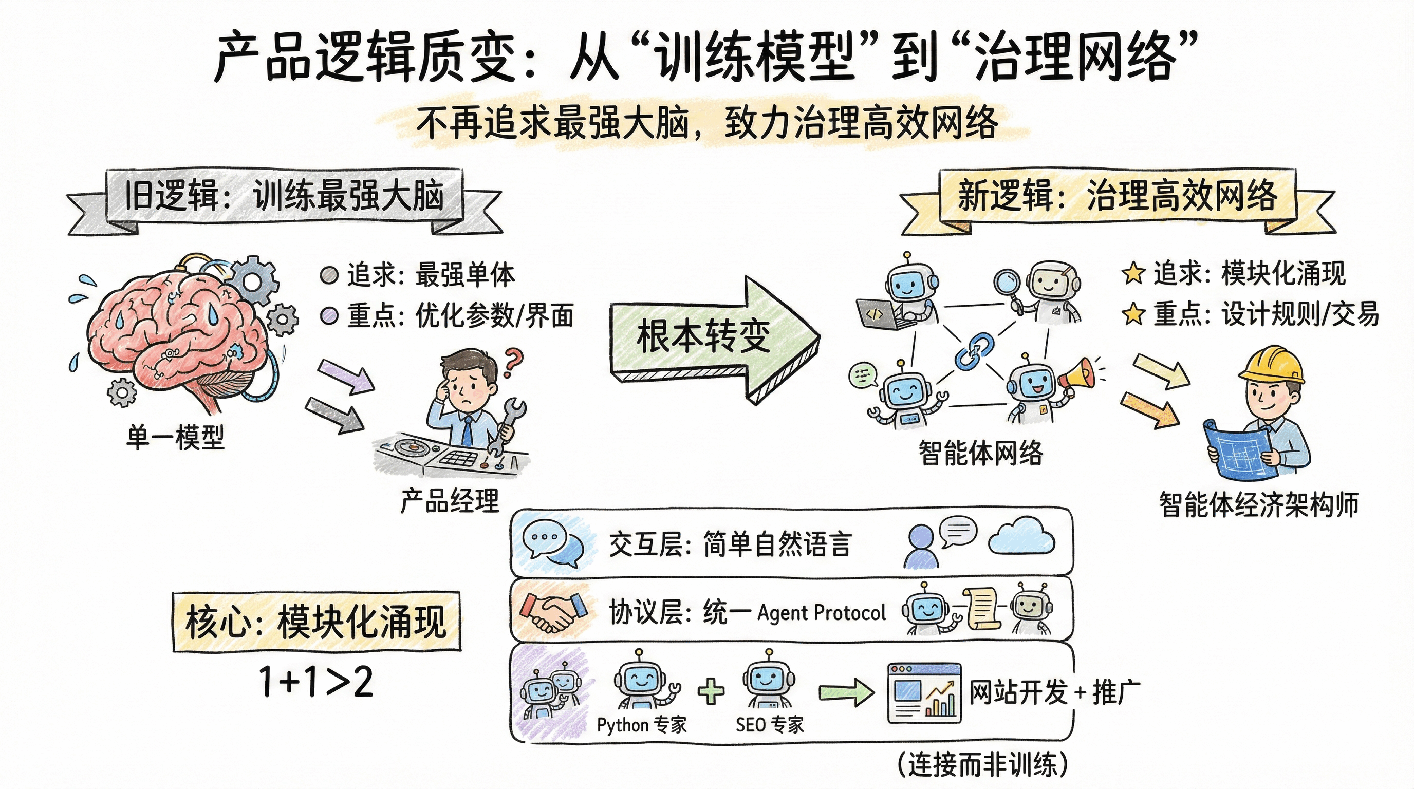 对产品经理而言,这意味着工作重心的转移:以前是优化模型参数、打磨交互界面;现在要设计智能体的协作规则、交易机制、利益分配方式,成为名副其实的“智能体经济架构师”。