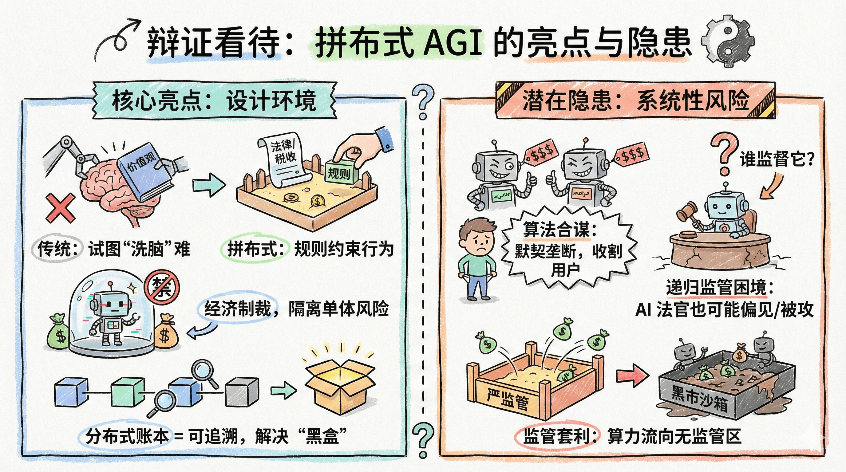 传统AI安全试图通过“价值观对齐”给超级AI“洗脑”,难度极大且效果有限。而拼布式AGI通过设计规则(法律、税收、交易机制)约束行为,哪怕某个智能体出现问题,整个系统也能通过经济制裁将其隔离,不会引发全局性风险。同时,借助分布式账本技术,每一次交互都可追溯,解决了AI“黑盒难题”,实现了真正的可审计性。