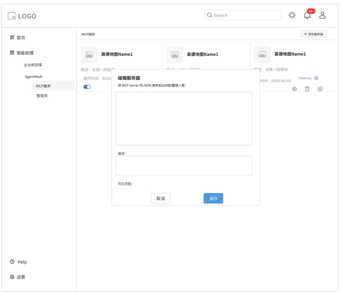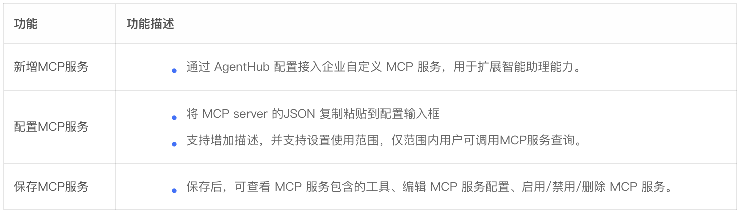 MCP 架构中有几个核心概念:Host、Client、Server,具体的概念解释可以查看官方文档。在智能助理AI内,智能助理即为 MCP Host,您需要封装好自己的 MCP Server,通过在 AgentHub 中创建与您的 MCP Server 1:1 的 Client,从而完成两个系统之间的对接。
