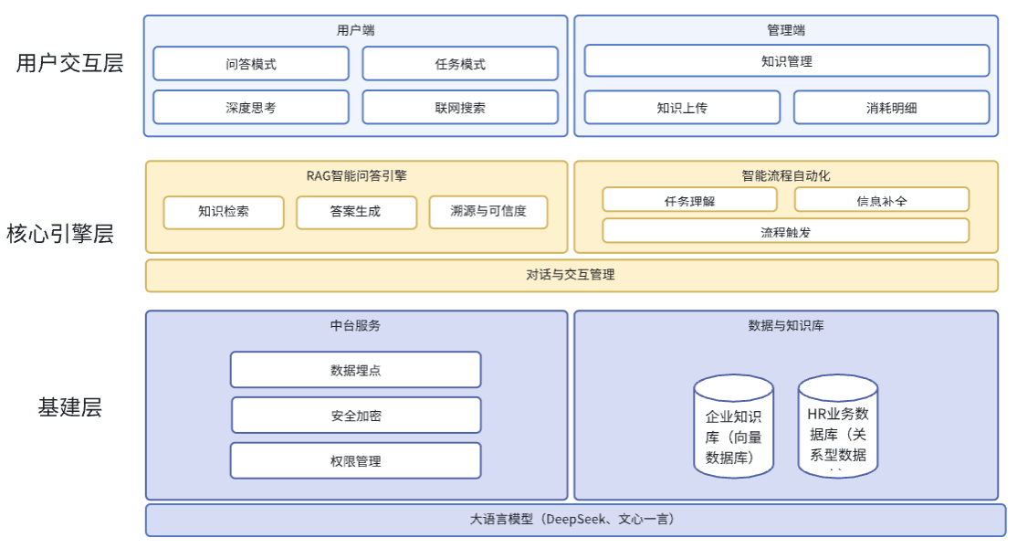 核心亮点为AI人事助手:通过智能问答提升员工体验;以智能任务处理自动化HR流程;并通过Agent集成连接chatBI、费用报销等系统,打破信息孤岛,打造一站式服务。