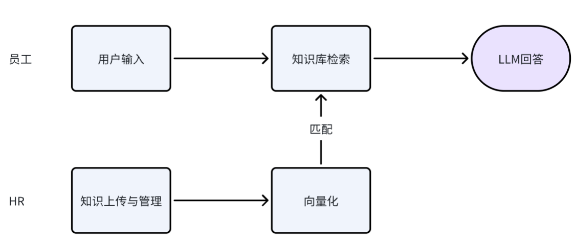 数据源:企业知识库(定时拉取增量文档,同步权限)、手动上传(管理员通过后台统一入口上传线下文档)、业务数据库(定期拉取结构化数据,如考勤规则等)