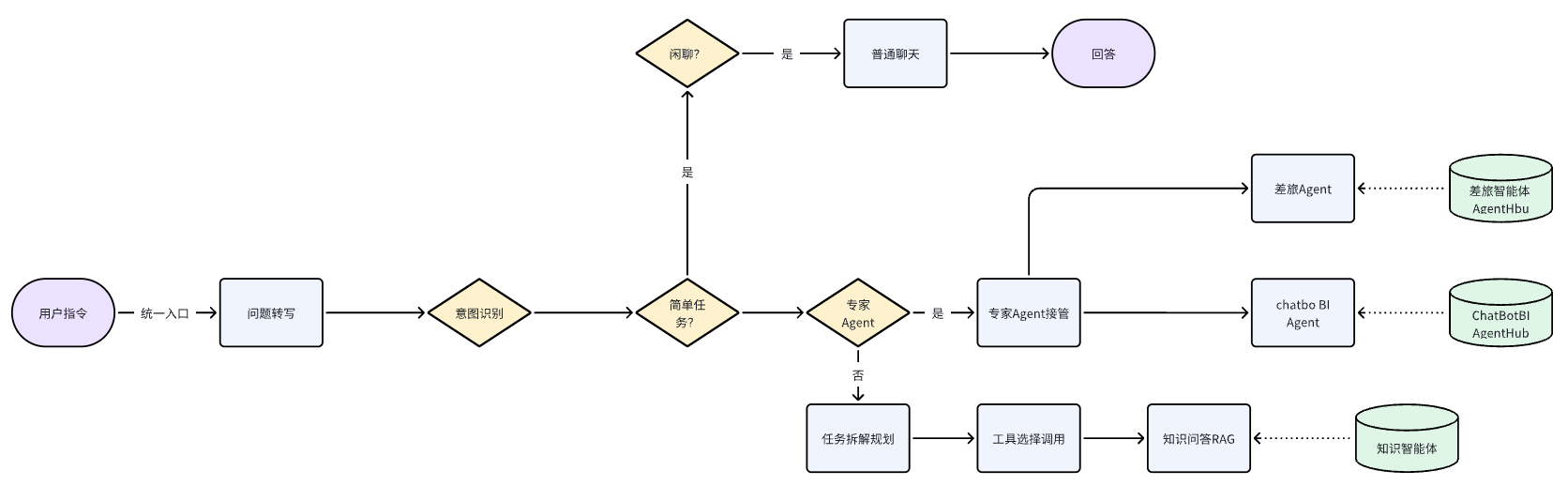 举例说明:用户问“研发部张三这个月迟到几次?”,NLP模块会抽取出[dept:研发部],[name:张三][部门:研发部],[time:这个月],[指标:迟到次数]等实体。系统识别出这是“数据查询”意图而不是事务办理,随即不再去知识库检索,而是直接调用考勤数据API,从而避免了RAG在精确数值查询上的天然劣势,将准确率从约80%提升至99%以上。