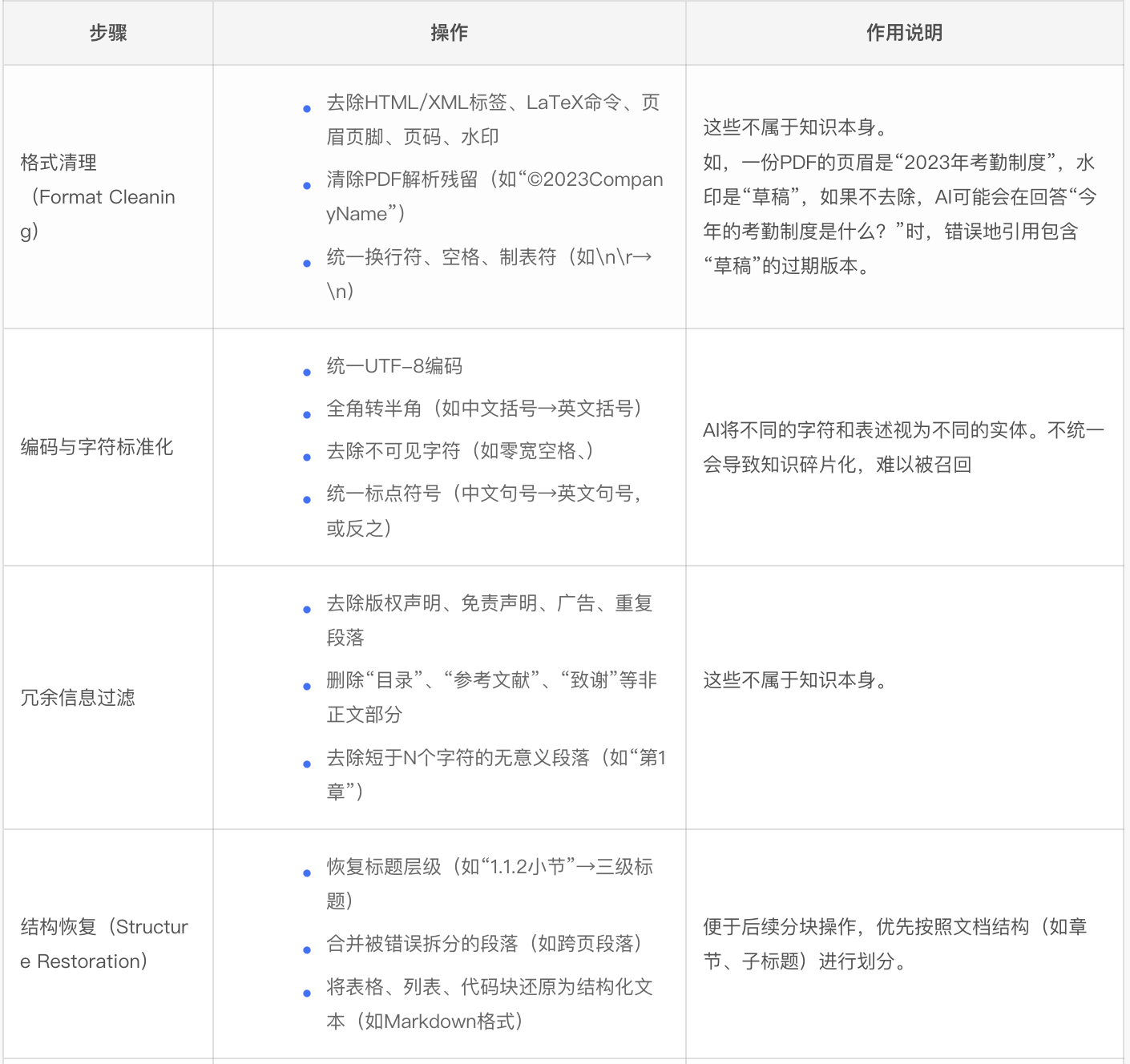清洗与分块 :删除冗余格式(如页眉页脚)、修正错别字,按标题层级(标题 1/标题 2)将长文档拆分为独立知识块(Chunk),提升检索效率