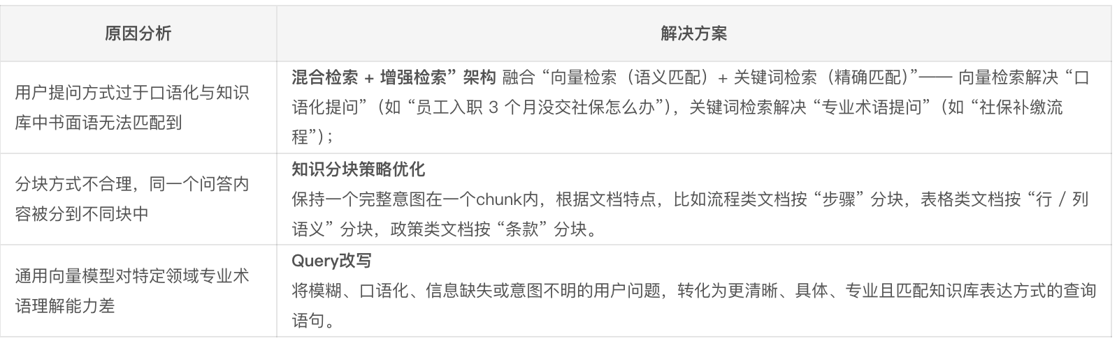 说明:融合 “向量检索(语义匹配)+ 关键词检索(精确匹配)”—— 向量检索解决 “口语化提问”,关键词检索解决 “专业术语提问”;