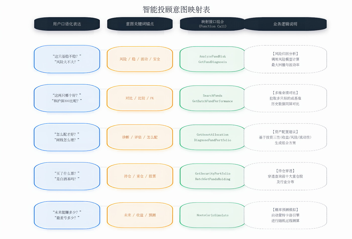 而本架构通过 MCP 协议深度集成了金融工程引擎,实现了计算能力的‘外挂内嵌’。当意图识别层捕捉到预测需求时,系统即刻接管 LLM 的文本生成逻辑,转而调用 MonteCarloSimulate 接口,在后台执行上万次随机路径模拟,输出具有统计学意义的收益分布数据。关于该机制在实际业务中的应用效果,将在后文四、场景实战中‘场景二:专业概率交付’中详述。