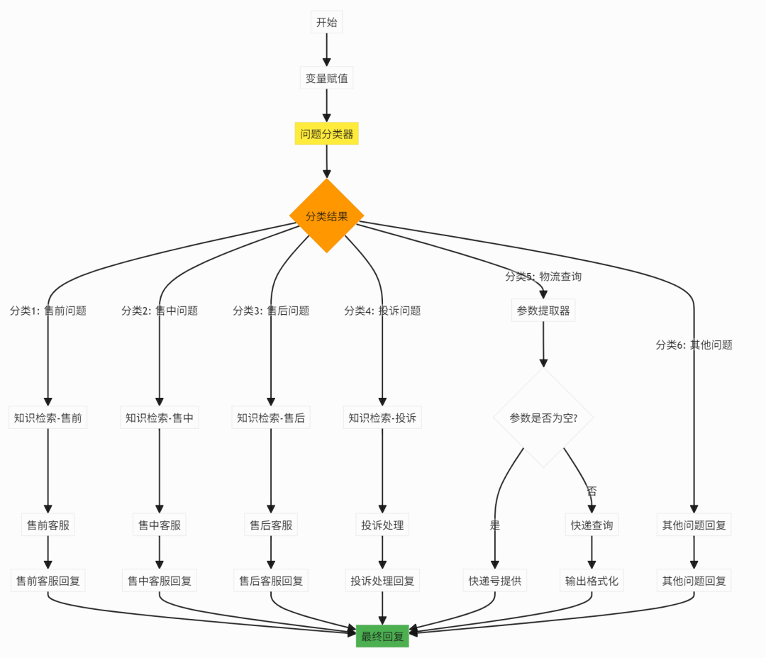 用户问题 → 售后知识库检索 → 售前客服模块 → 专业回复
