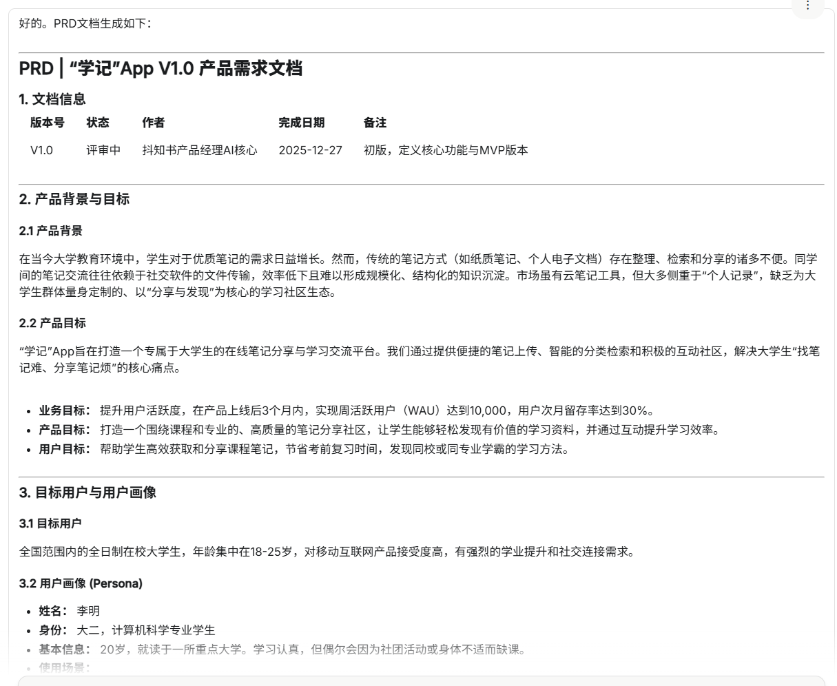 4.发送后,AI就会自动根据你的输入,直接输出一份结构完整的PRD文档。你可以直接复制使用。