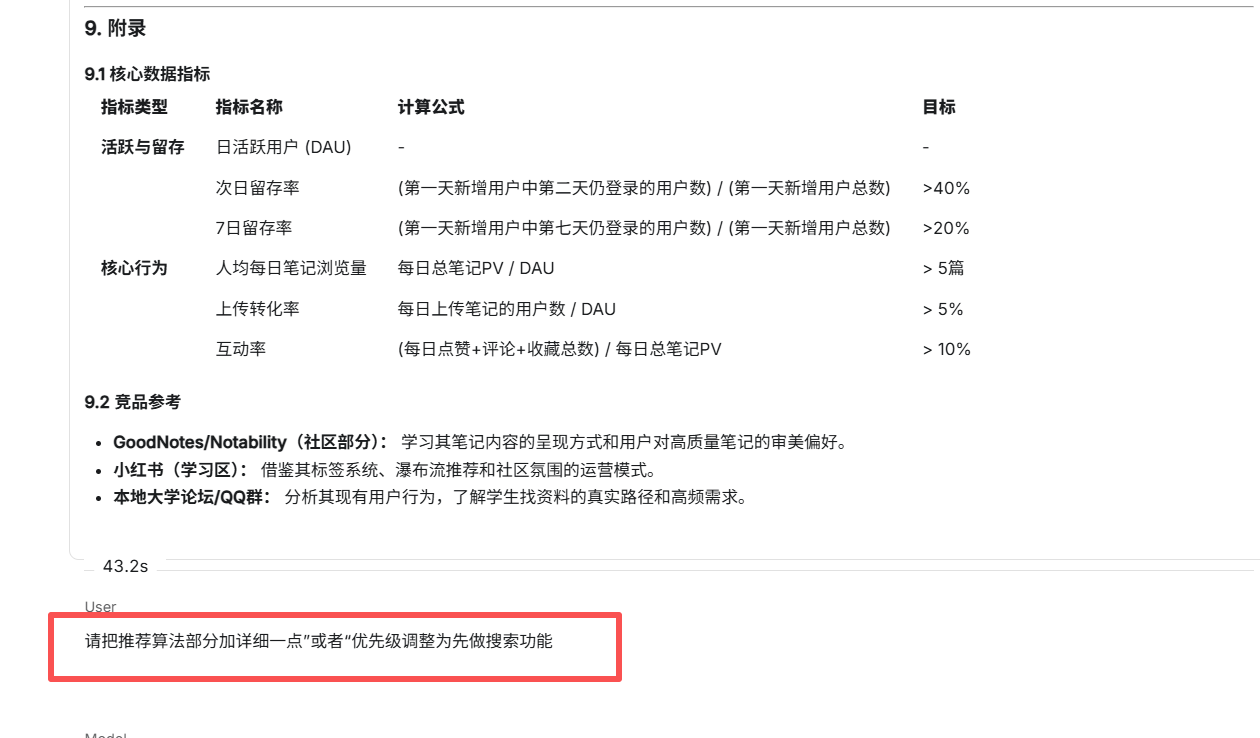 5.如果生成的PRD有不满意的地方,继续在同一个对话里说修改要求,比如“请把推荐算法部分加详细一点”或者“优先级调整为先做搜索功能”,AI会基于核心继续优化,直到你满意。
