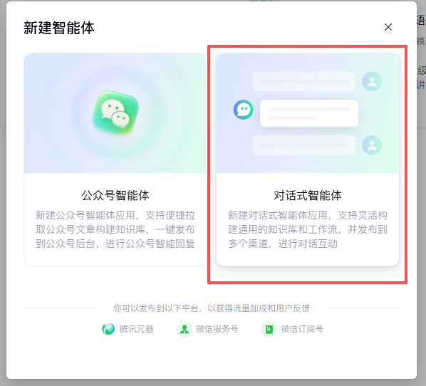 进入腾讯元器平台,用微信扫码登录后,点击新建智能体选择对话式智能体。