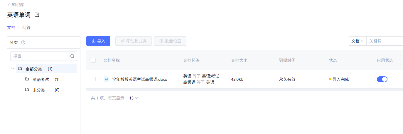 知识库上传:我根据搜索全网各年龄段考试高频词,按24位字母划分的高频词汇总成的知识库,上传至元器知识库,支持按学段(小学 / 初中 / 高中 / 成人)、考试(高考 / 四六级 / 考研 / 托福/雅思)分类,大模型调用时可精准引用;