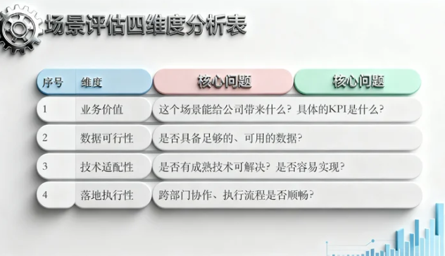 为了让企业在启动AI项目之前就能快速判断场景价值,可以采用以下四个核心维度: