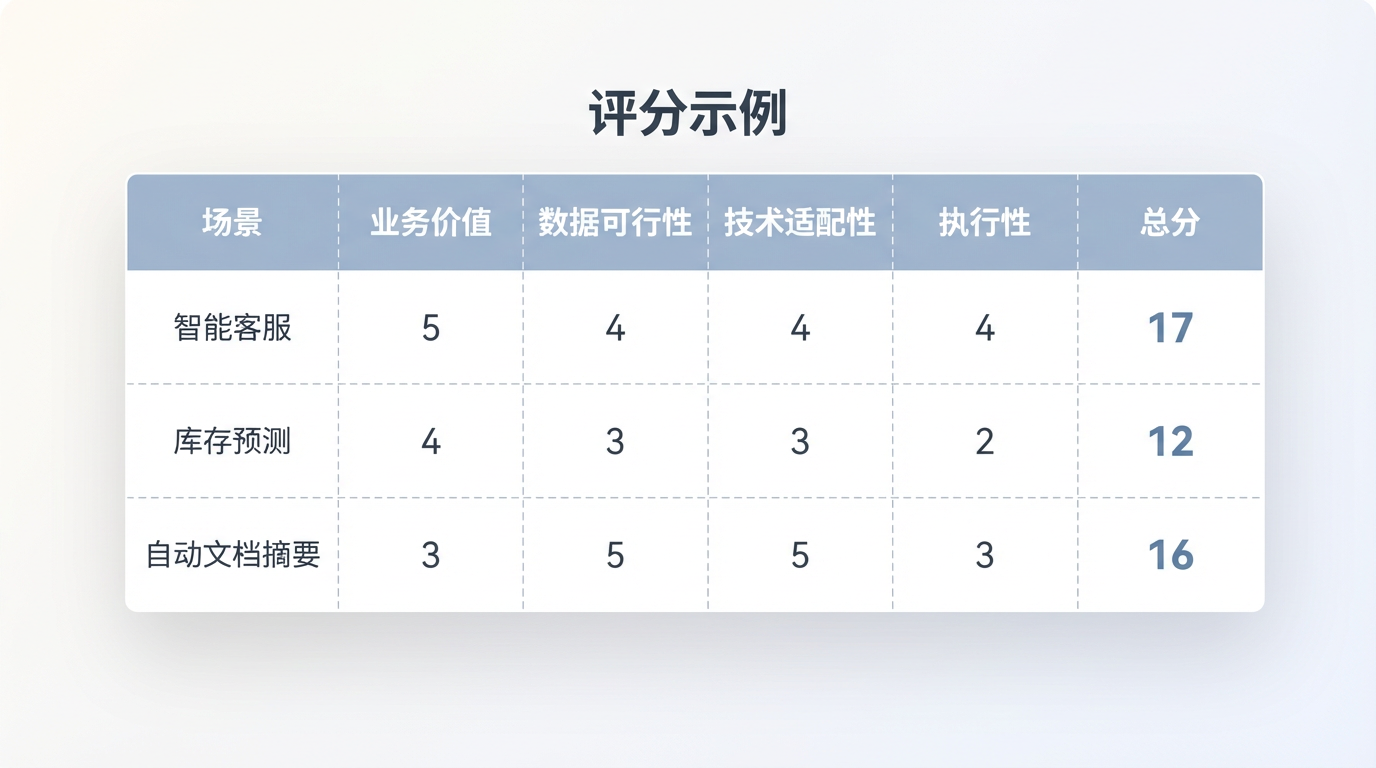 对每个场景进行评分,然后计算整体得分并排序。这样能让AI项目从主观判断变成可比较、可追踪的价值优先级体系。