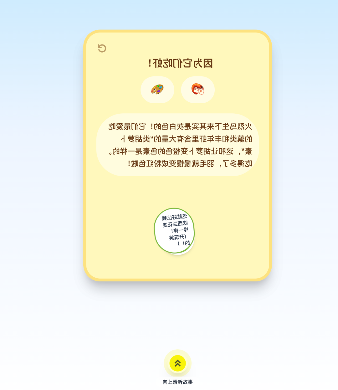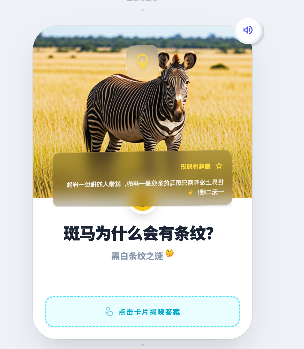 - 【互动】 我们采用卡片式学习设计,每张卡片都是一次探索。孩子可以通过滑动(上下左右滑动)、点击等方式与内容互动,学习不再是被动接受,而是主动探索。就像打开一个个“奇怪”的知识盒子,发现里面“奇怪”又有趣的世界。