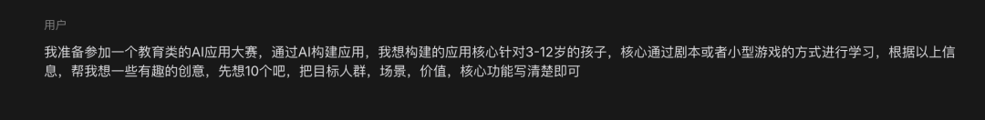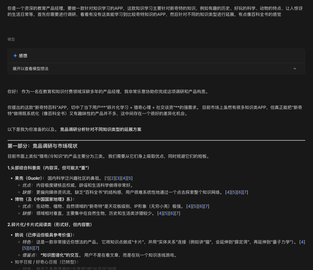 我先让他扮演一个产品经理进行调研,角色、背景、任务、目标均给到了,现在的prompt不用像之前那样刻板,非要有标准化结构,要把细节描述的特别清晰,合理且清晰的说明即可