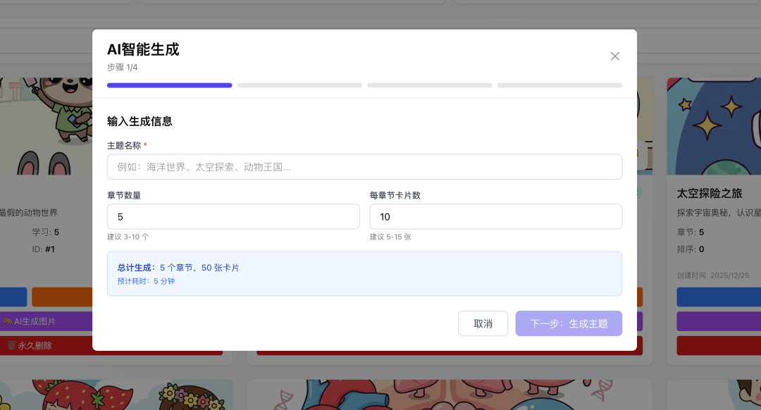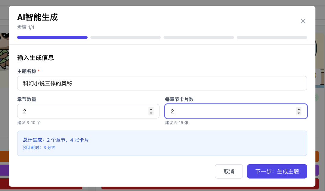 通过输入一个主题,章节数量,章节卡片数后台的脚本会自动执行生成需要的内容