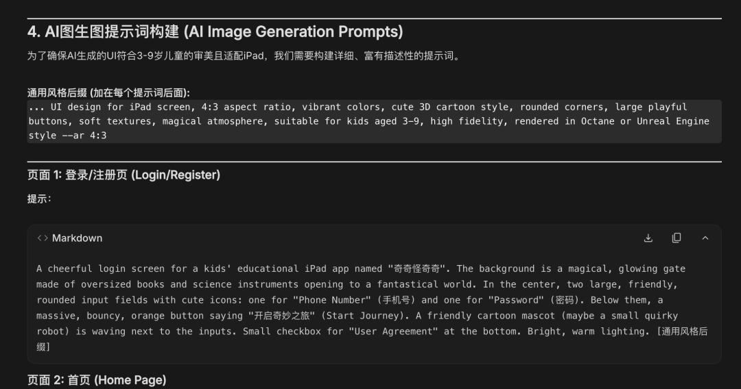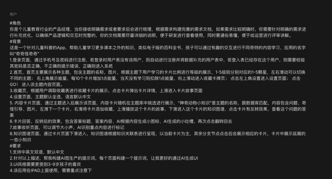 通过AI构建不需要特别明确的产品文档,我将核心页面的一些描述进行了整理,提供给AI让AI进行完善,定义了角色、背景、页面说明、要求,因为这里我已经想好了整体的交互逻辑,因此给的是相对明确的要求。顺便也让他把需要构建页面的提示词生成了。