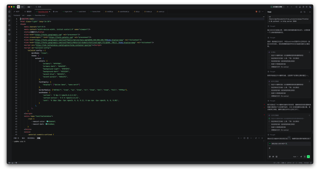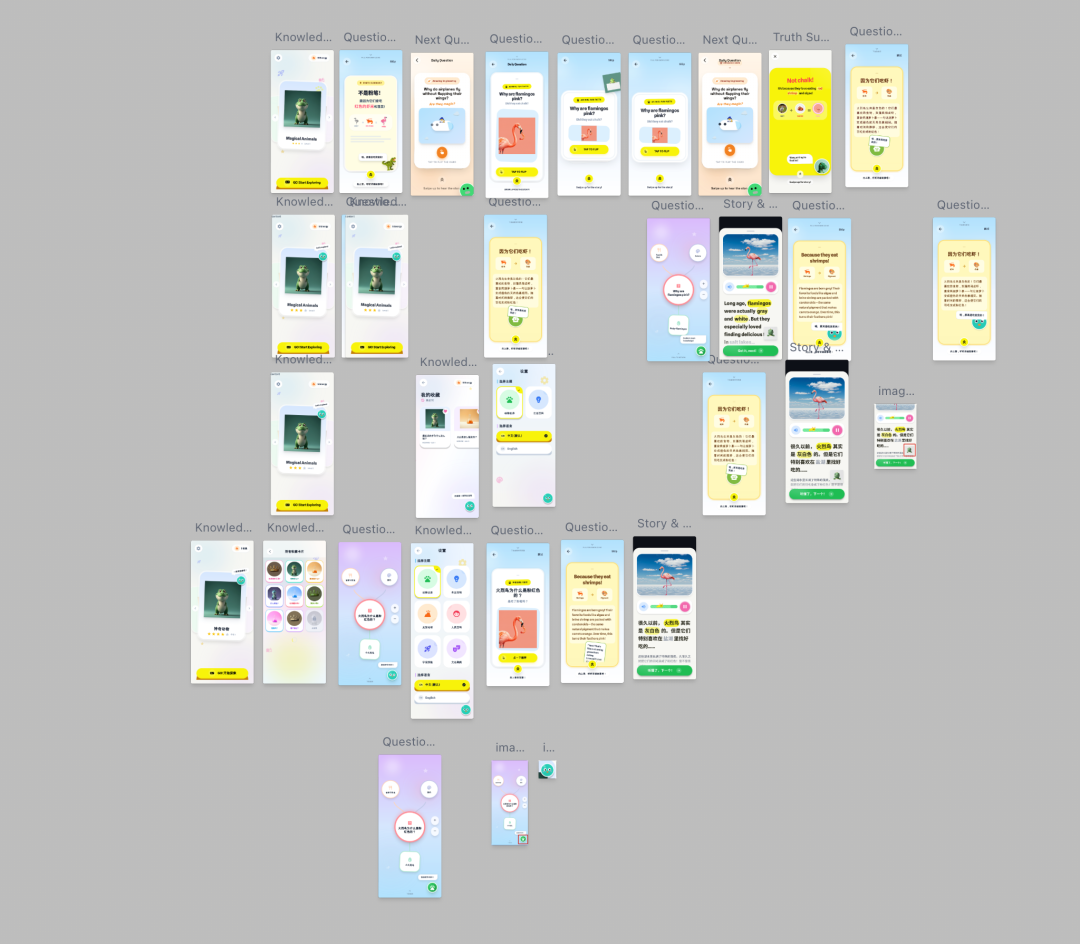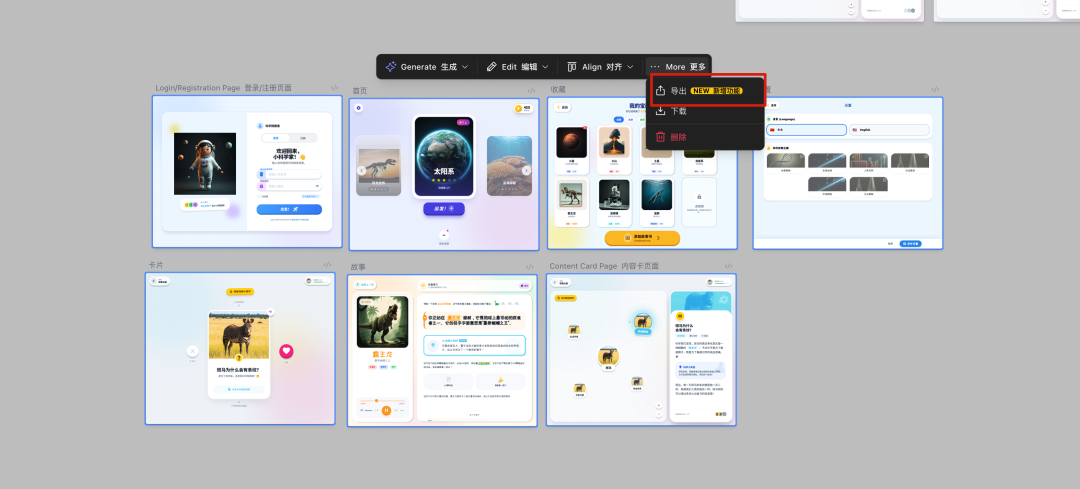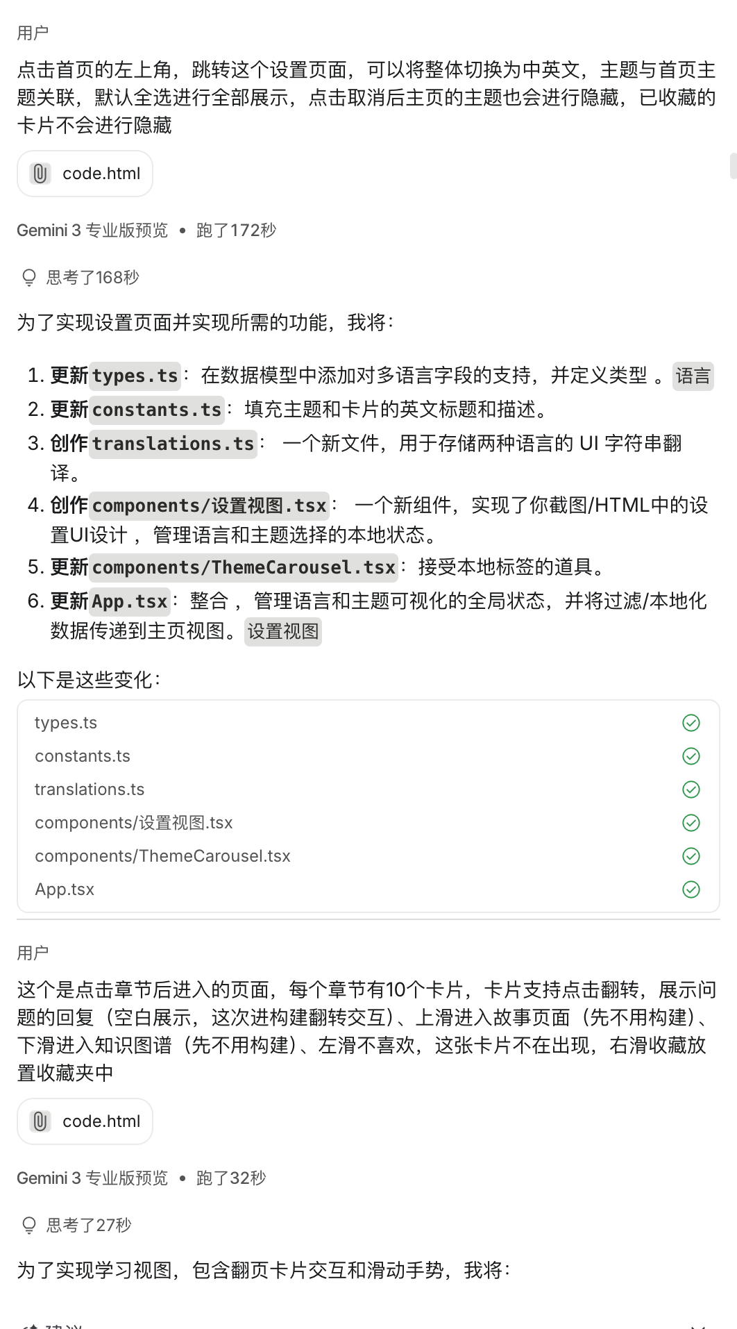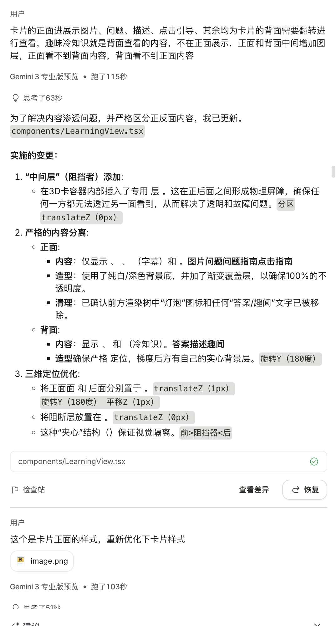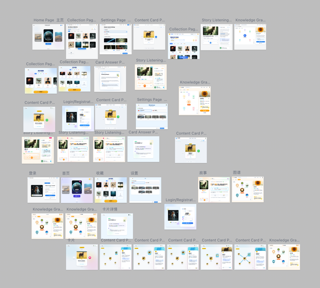 我将每个HTML页面进行导出,开始进行一个一个页面进行构建,从登陆-首页-收藏-设置-卡片-左右滑动效果-翻转效果-上滑AI绘本-下滑知识图谱,以下是部分内容截图,每个页面基本上需要调整十几次才可以,部分页面需要几十次
