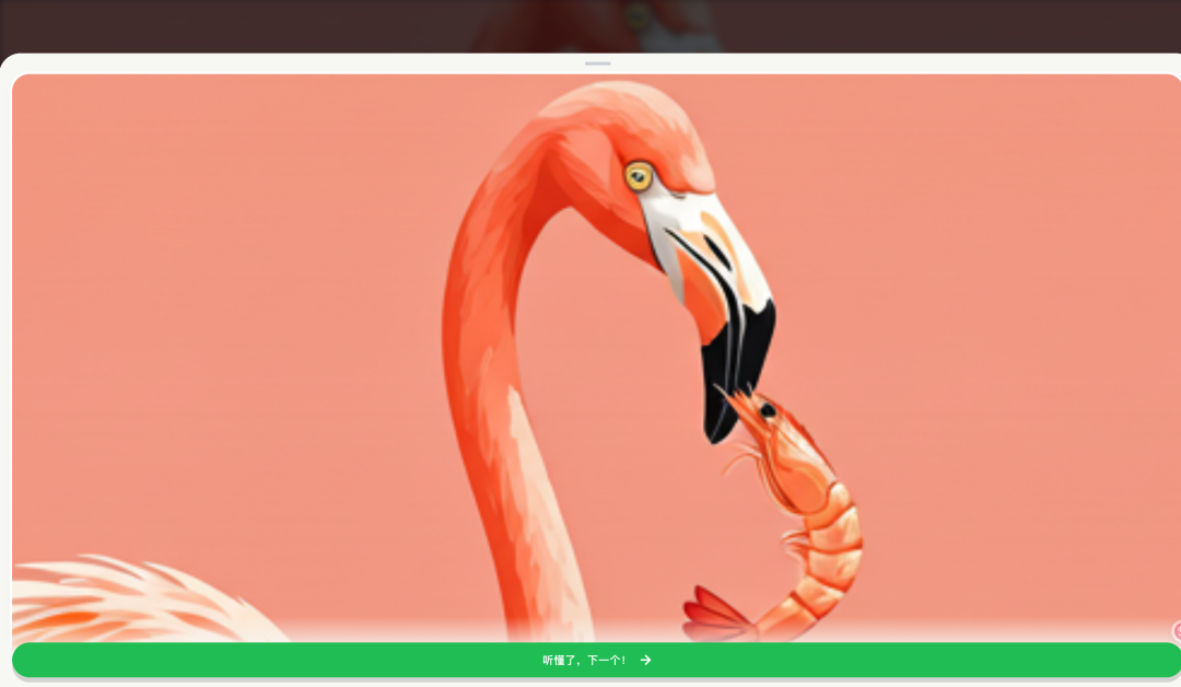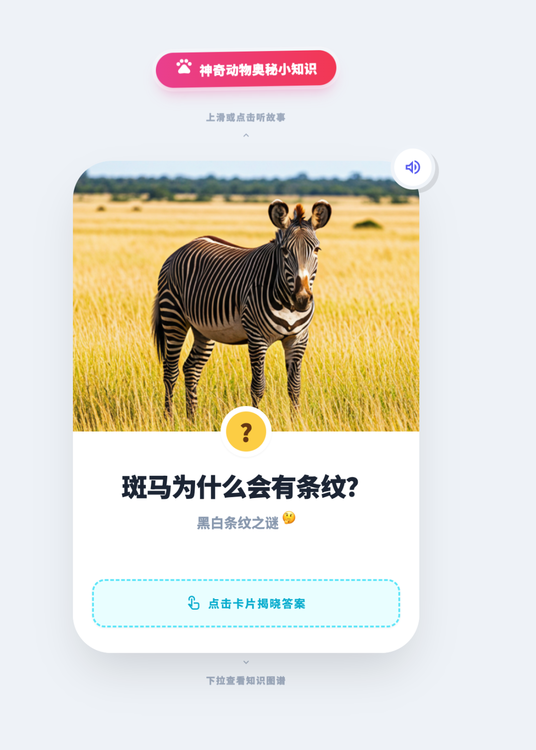 内容卡片页面,通过主题进入后展示该页面,内容卡片随机在主题库中挑选进行展示,“神奇动物小知识”是主题的名称,跟数据库匹配,内容包含问题、奇怪引导、图片,左滑下一个卡片,右滑将卡片添加收藏,上滑播放这个卡片的故事,下滑进入这个卡片的知识图谱,点击卡片有反转效果,查看这个问题的答案