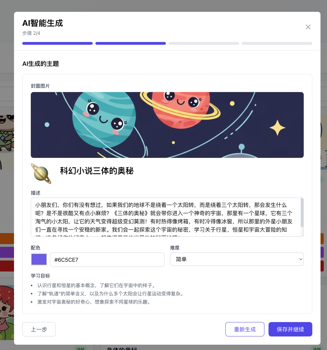 - 【个性化】 AI会根据孩子的学习历史,智能推荐相关内容,调整学习难度,真正做到因材施教。每个孩子都能找到适合自己的学习路径。