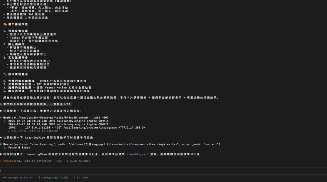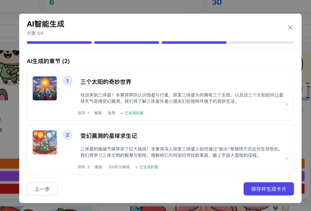 - 【游戏化】 我们设计了完整的积分体系:注册送100积分,完成卡片得5积分,完成章节得50积分。孩子可以用积分解锁新章节,就像玩游戏一样,不知不觉中完成了系统学习。
