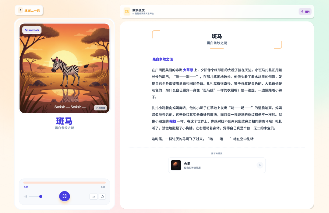 7.故事收听页面,可以调节大小声,AI识别重点内容进行标记