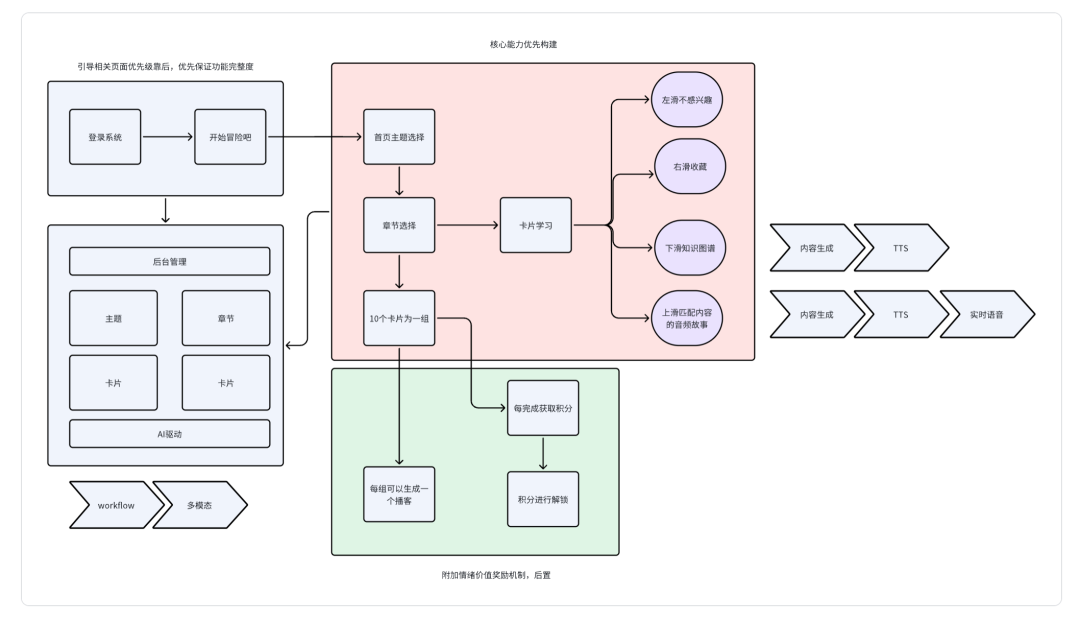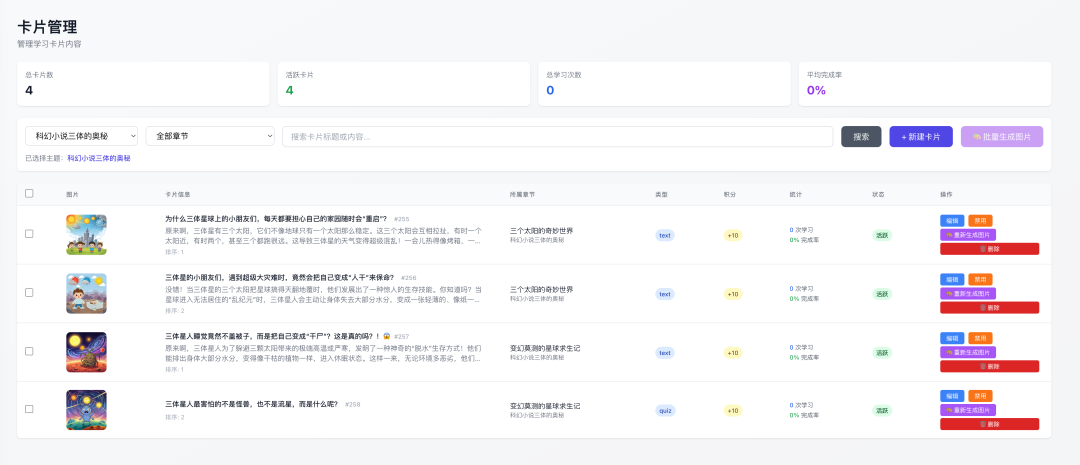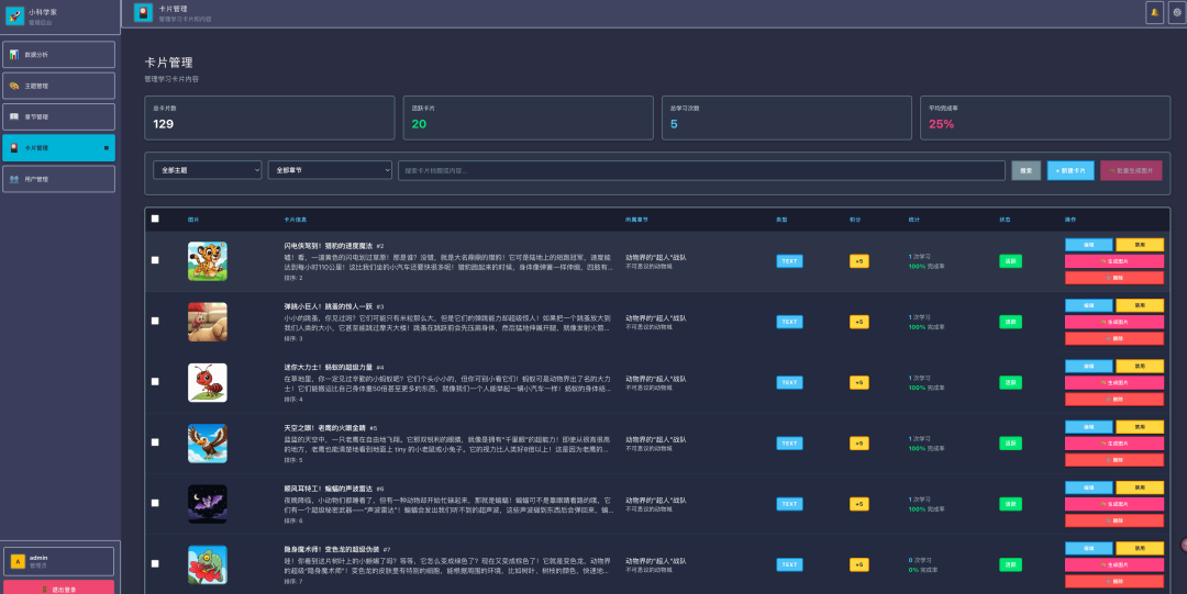 后台管理:主题、章节、卡片都是基础的内容,也是核心,也是需要最下心思的,往常的内容需要教研,原画师等进行规划绘画等,通过AI能力构建更便捷的能力,但AI单点生成成本又高,我直接在后台构建workflow模式实现整体的能力构建