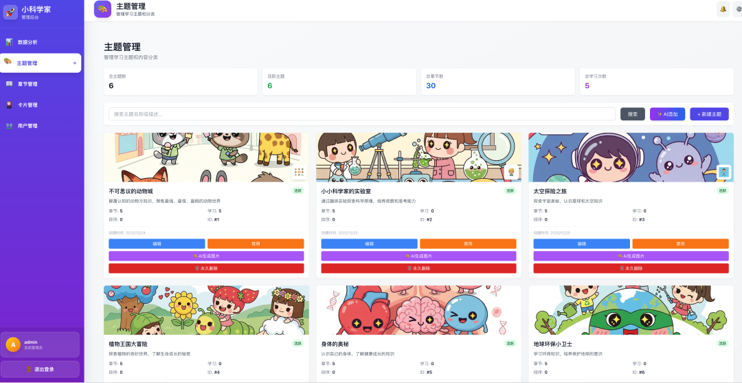 3.主题表:包含主题名称、主题图片、关联内容数,默认构建动物奥秘、史前地球、人类百科、生活真相、宇宙探险、文化趣闻这6大主题
