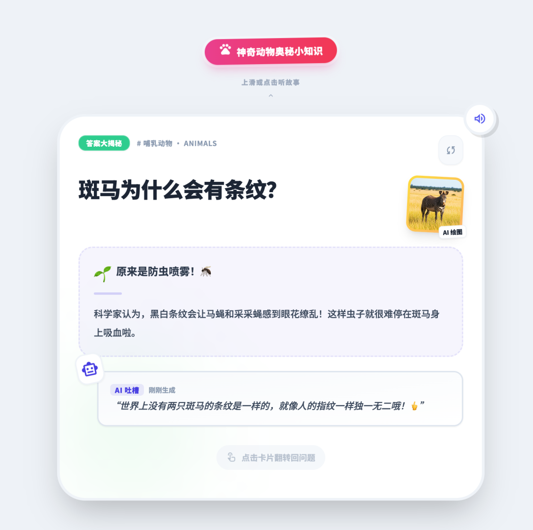 6.卡片回答,反转后的效果,包含答案标题、答案内容、AI根据内容生成小图标、AI生成的小吐槽,再次点击翻转回去