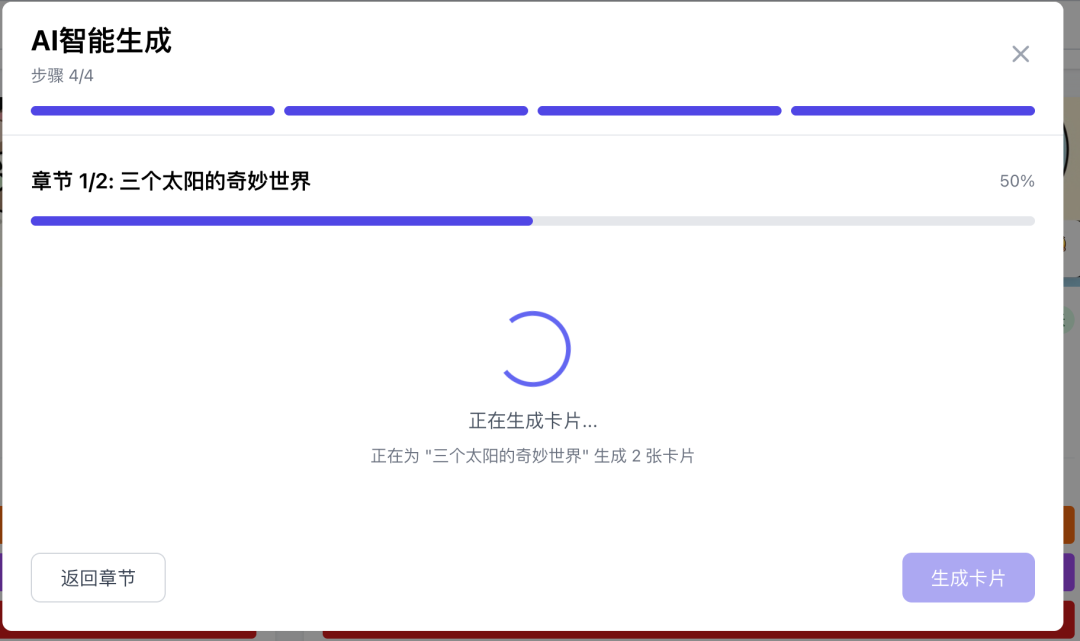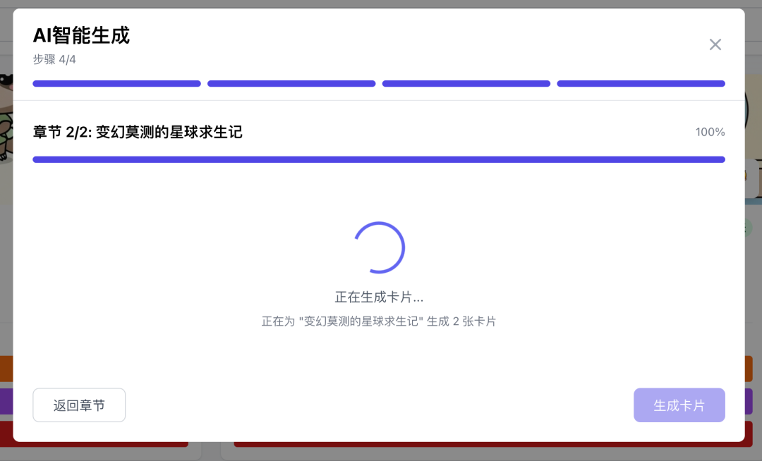 章节生成完成后,进行卡片的构建会将卡片拆解为多个任务,继续后会生成相应的卡片图片