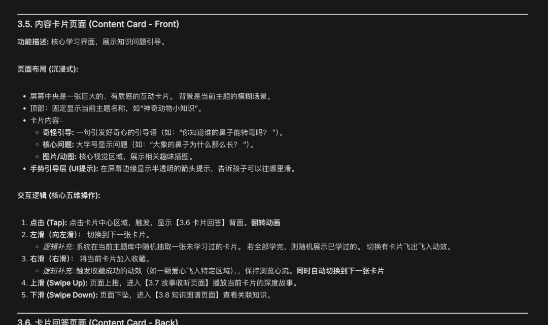 全部的文档就不在这里展示了,实话说写的已经很详细了,不过作为产品没有写数据相关的,可能是我提示词给我不够清晰,其实应该把数据的一些信息或者结构表明会更清晰,便于后续的后端延展。