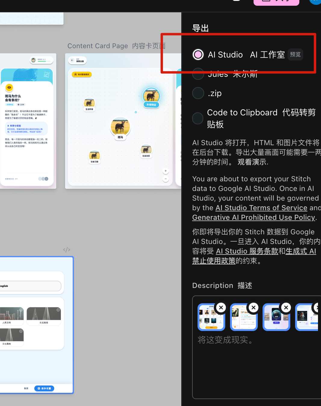 因为本身stitch平台与AIstudio都是谷歌体系,可以一键直出