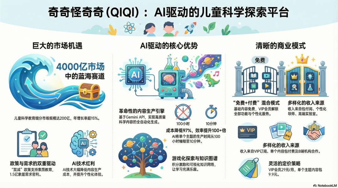 传统的科学教育往往枯燥乏味,孩子学不进去;而娱乐性的内容又缺乏教育价值。 “奇奇怪奇奇”看到了这个巨大的市场空白——一个既能激发兴趣,又能系统学习的科学教育平台。