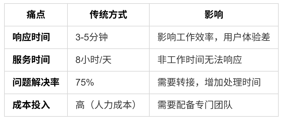 企业内部客服最头疼的事是什么?不是回答问题,而是响应不及时、知识覆盖不全、成本居高不下。员工遇到问题需要排队等待,客服人员知识储备有限,7×24小时服务成本巨大。