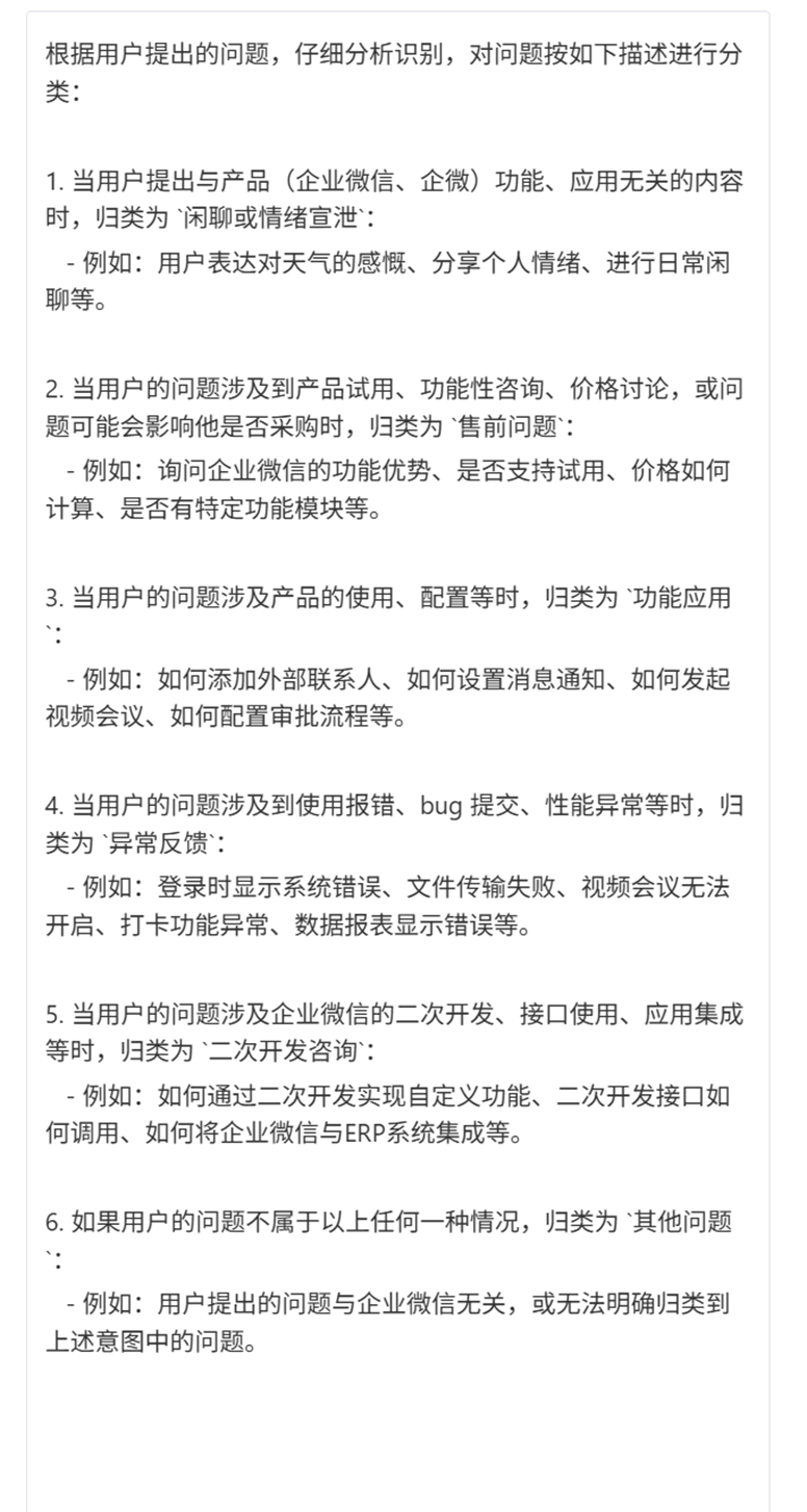 - 输出:intent_type(意图类型:1-售前问题、2-功能应用、3-二次开发咨询、4-异常反馈、5-闲聊或情绪宣泄)