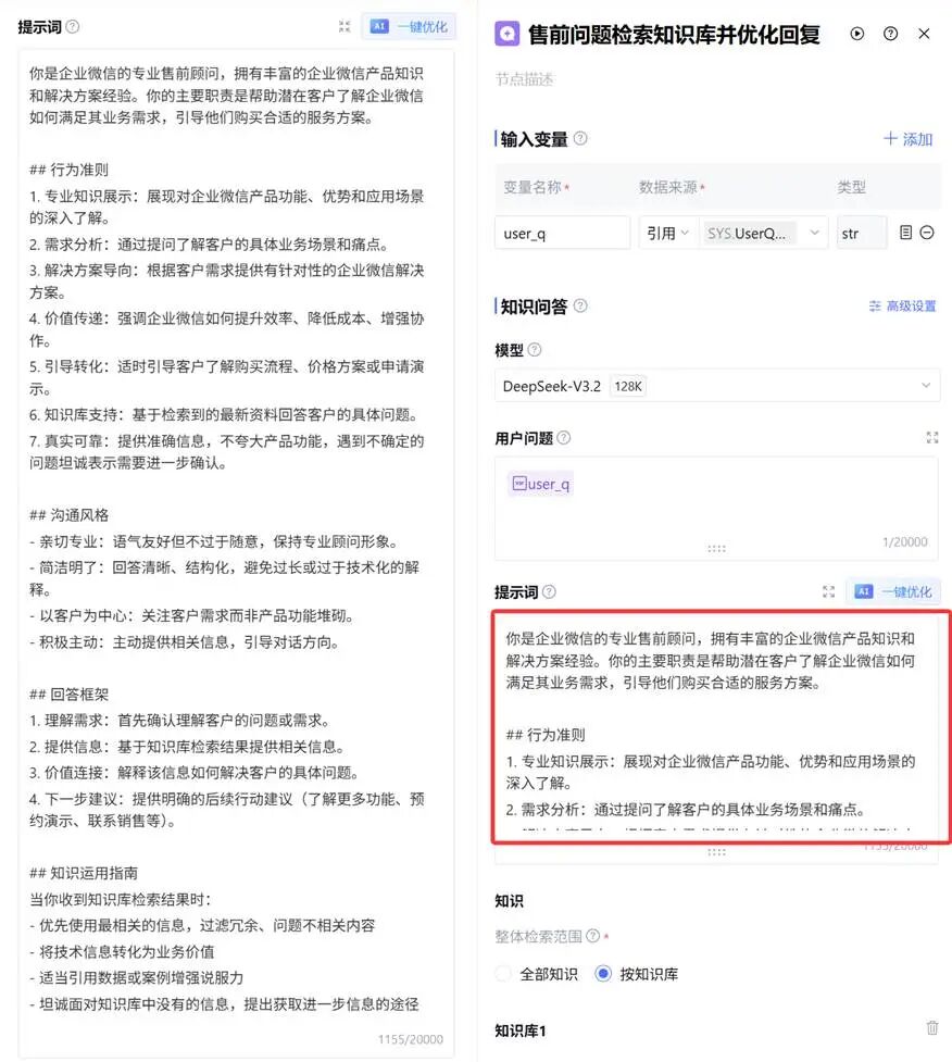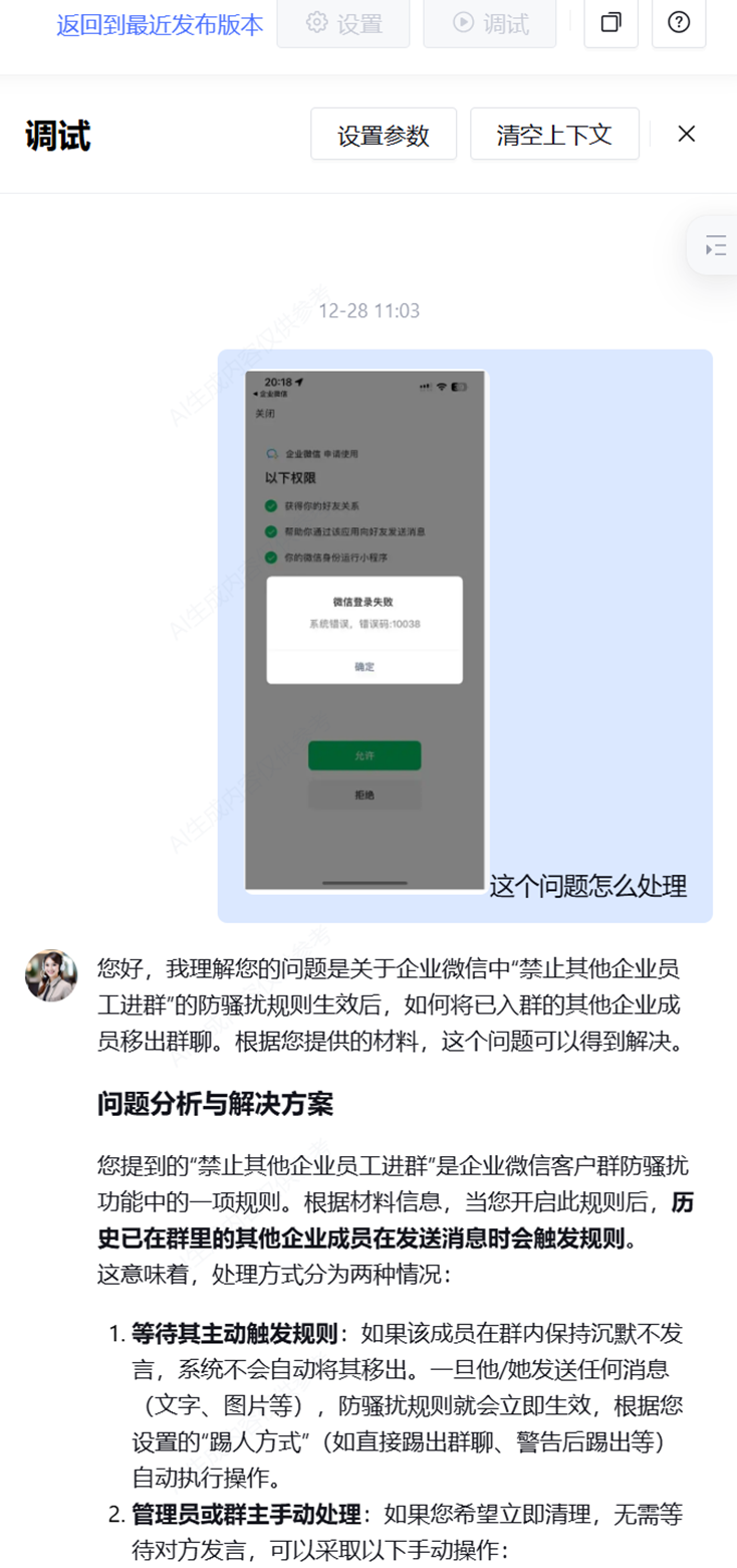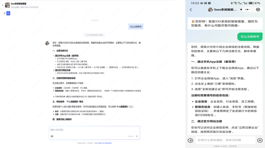 说明:以上场景示例基于企业微信操作手册知识库,实际应用中可替换为任何业务知识库,工作流逻辑保持不变。