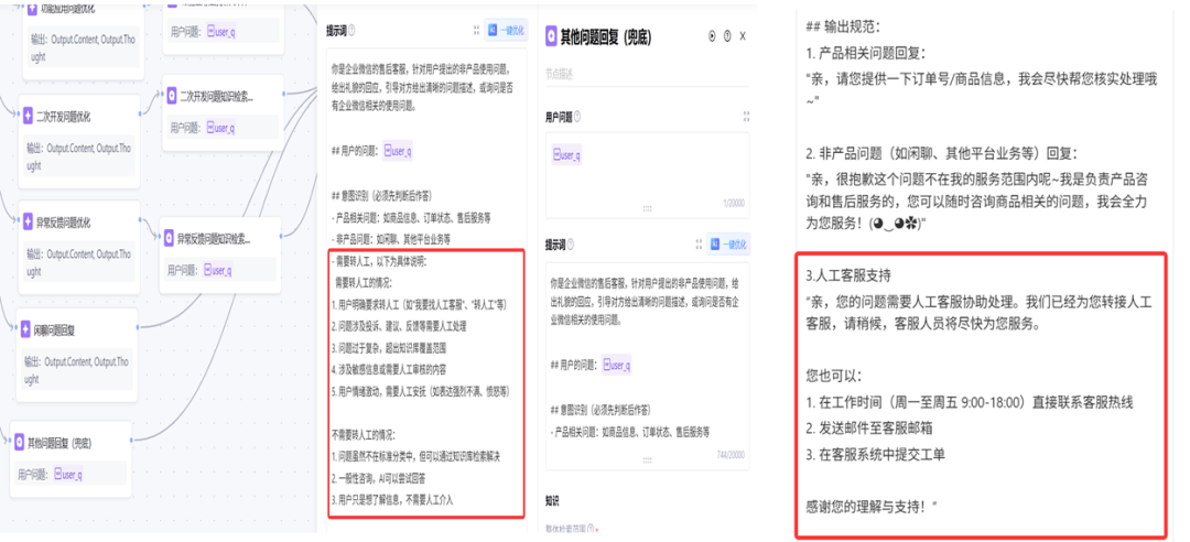 对于识别为”其他问题”的用户咨询,系统会智能判断是否需要转接人工服务。这确保了复杂问题等场景能够得到人工专业处理,可以添加转人工判断节点: