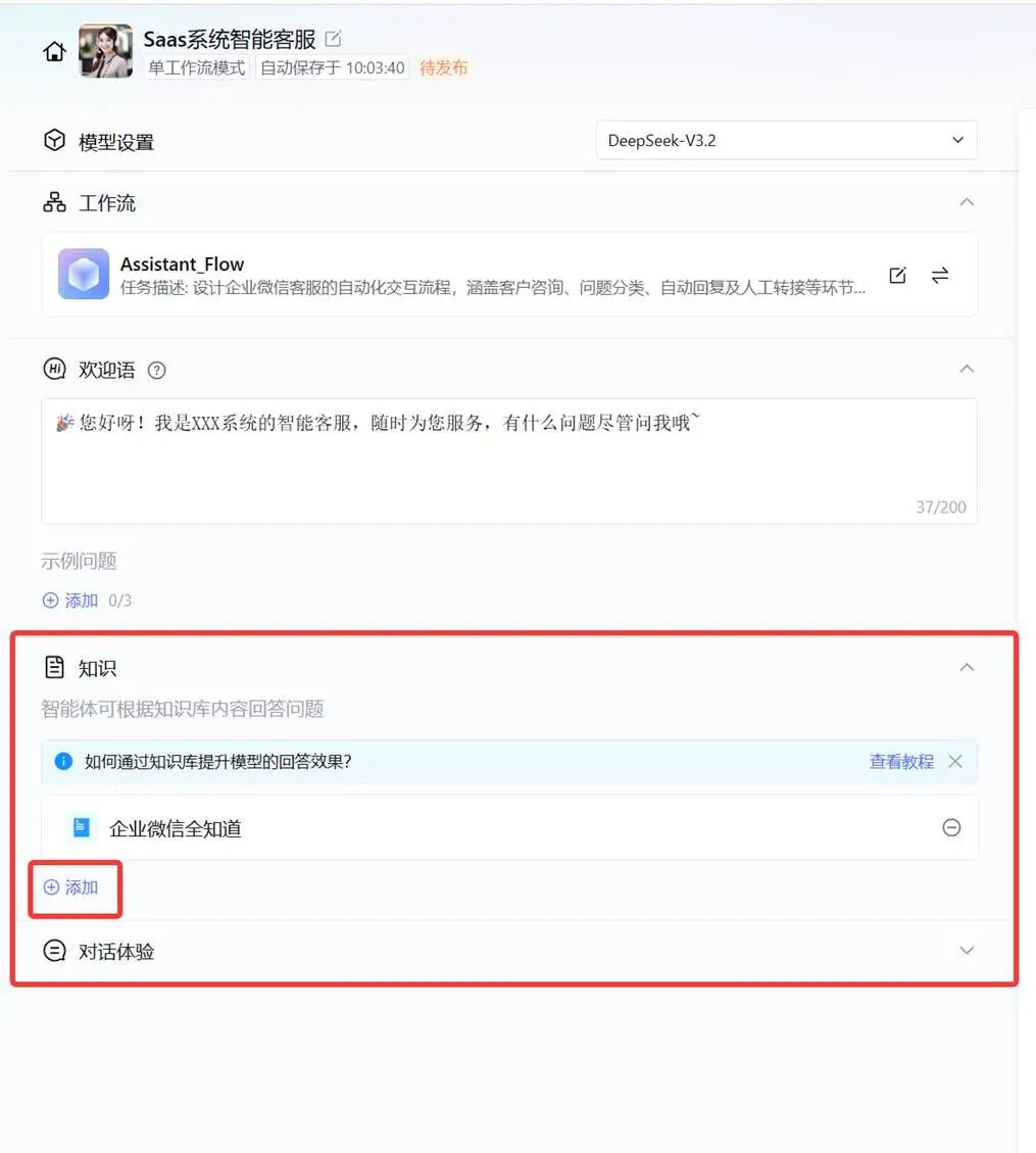 - 知识库配置:本案例以企业微信操作手册作为示例,实际应用中可替换为任何业务知识库 知识库添加:先要在智能体添加(这步很关键,不然在工作流里是选不到知识库)