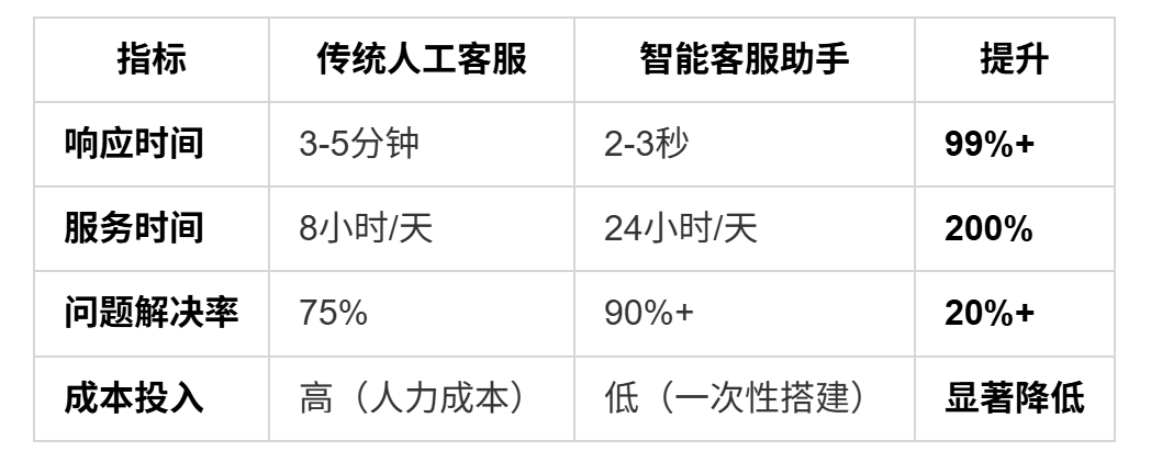 智能体方式:响应时间2-3秒,7×24小时服务,问题解决率90%+,成本可控。