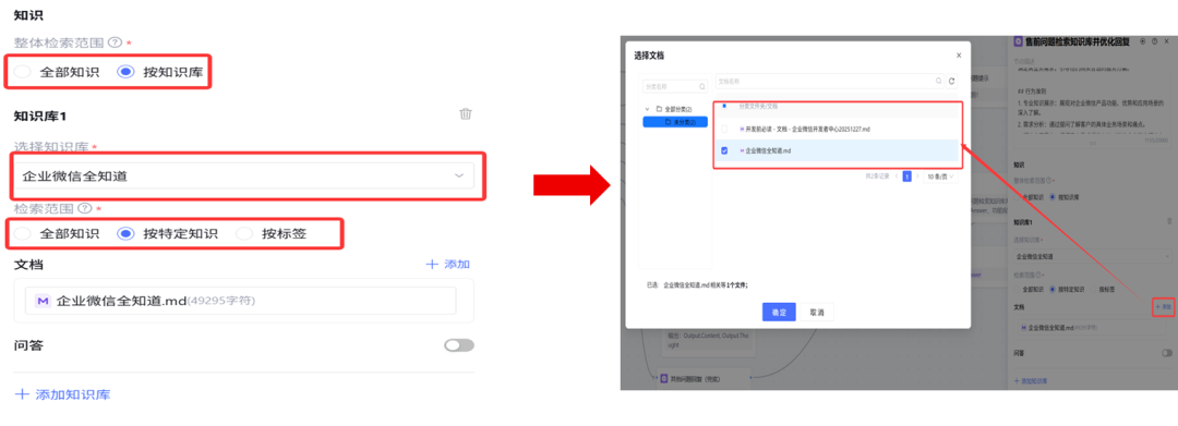 节点知识库配置:支持指定知识库,指定知识库的”全部知识“,“按特定知识”,“按标签”