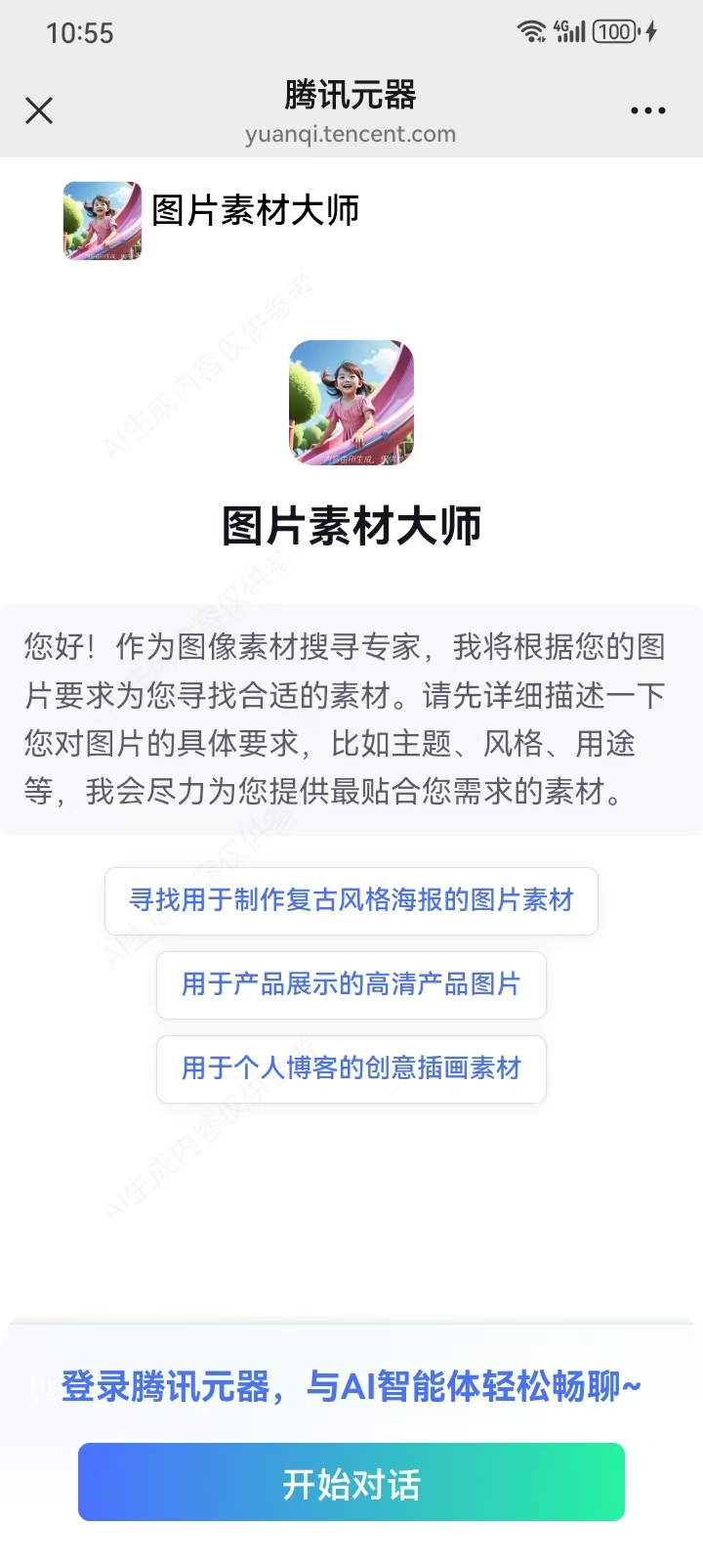 之前找图片素材,总是在网上到处找,花了大量的时间,找到的还不一定满意,有个专业的找图片素材工具就好了,通过腾讯元器平台的智能体实现了专业找图片素材的功能,提高了搜图效率。