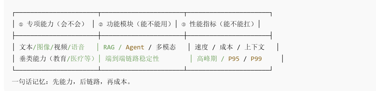 对我来说,专项能力评测的目标很明确:它不是为了找“最强模型”,而是为了确定“它有没有资格进入下一关”。我宁愿在这一关把明显不合格的模型挡掉,也不想把它带进系统链路里浪费工程时间。
