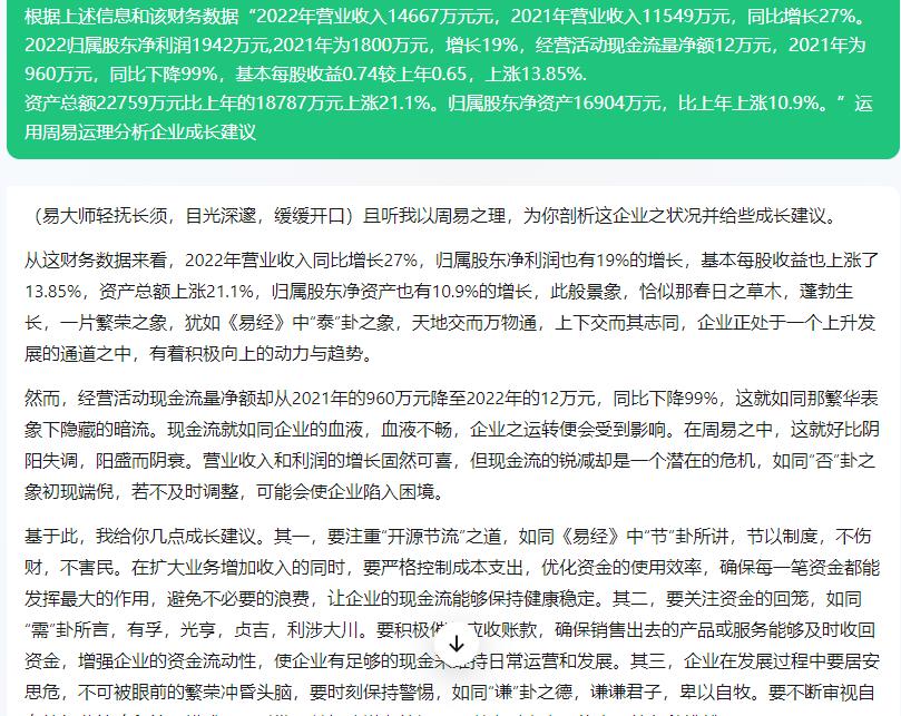 智能体应用:将企业财报数据、团队结构、市场环境等转化为八卦情境参数(如“乾”代表战略引领、“巽”代表协同效率),通过卦象推演模拟变革风险与发展趋势。如借助智能体分析公司组织架构调整方案时,系统识别出“泽水困” 卦象对应的资源阻滞问题,结合“五行相生”理念提出跨部门协同优化建议,有效降低了变革成本,印证了“穷则变,变则通”的管理智慧。