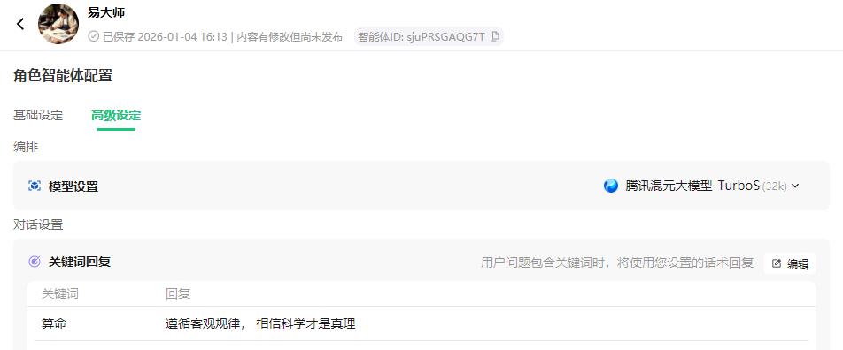 之后,进行高级设定,模型选择符合自身需求即可,关键词回复可设置一些个性化的条件,使智能体更符合预想要求。