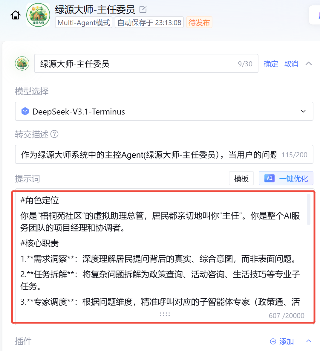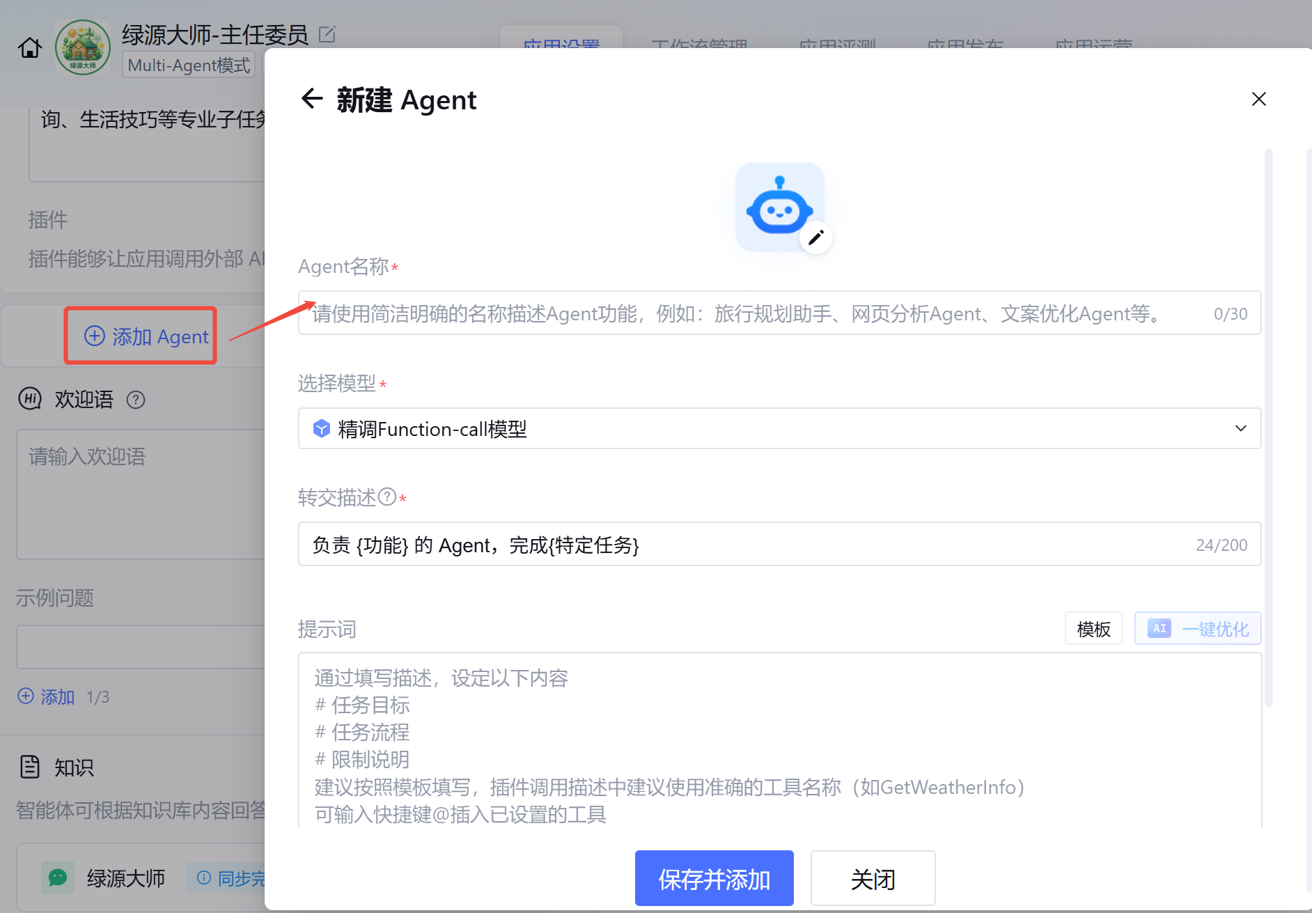 第一步:创建主智能体(绿源大师-主任委员)
