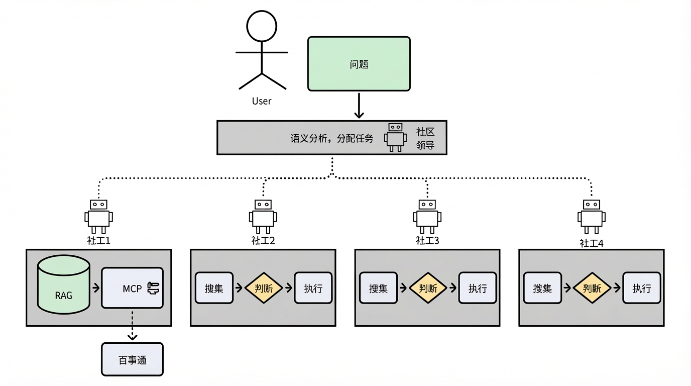 我们上传了市区的政策PDF、社区过往的通知。回答的准确性提高了,但它依然“机械”。当居民问“我家的盆栽枯枝怎么处理最好?”时,它只会复述“属于园林垃圾”,却无法联动给出“本周六社区有集中堆肥活动,可带来制作肥料”的增值信息。它缺乏跨领域协同和主动服务的能力。