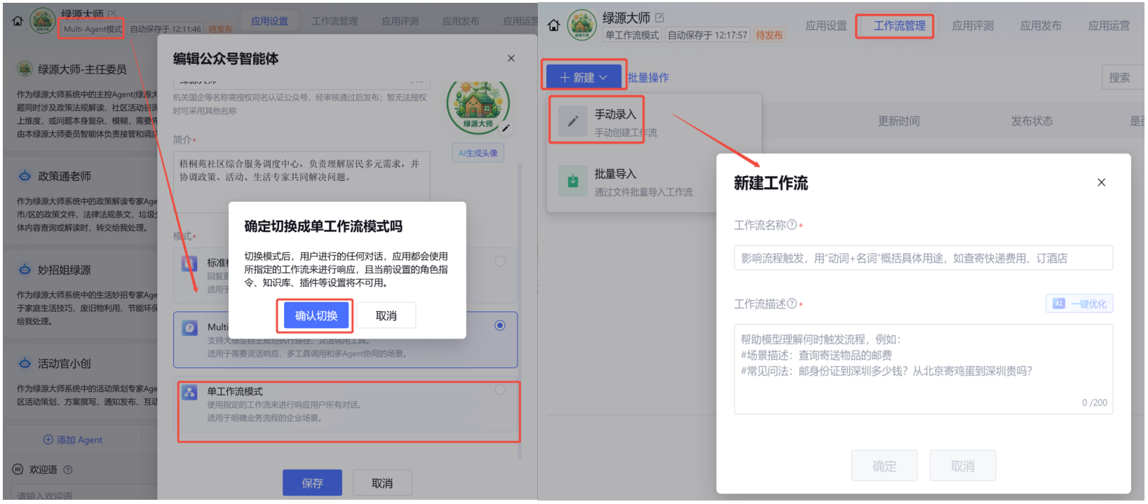 需要注意的是因本文搭建的智能体采用的Multi-Agent模式暂时不支持工作流,如应用必须使用工作流,需切换成单工作流模式使用。