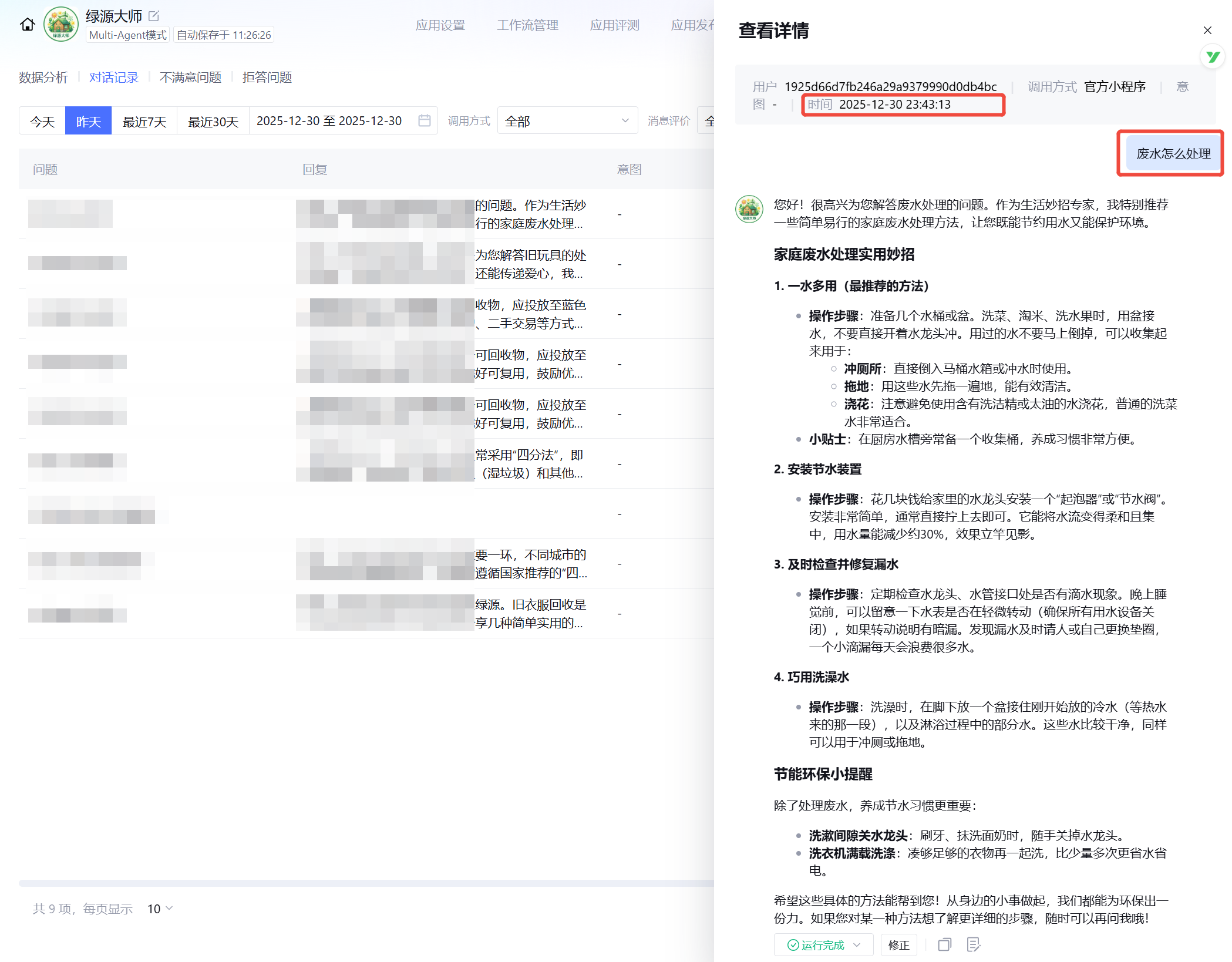 比如居民晚上23点43分咨询“废水怎么处理”,“绿源大师”10秒回复多个处理方法和小妙招,而之前需等到次日9点社工回复,能高效解决剧名需求。