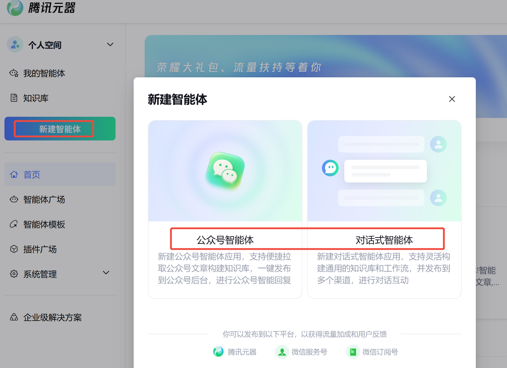 - 关键选择:在弹出的窗口中,务必选择「公众号智能体」。只有这样,后续才能一键导入公众号全部内容。