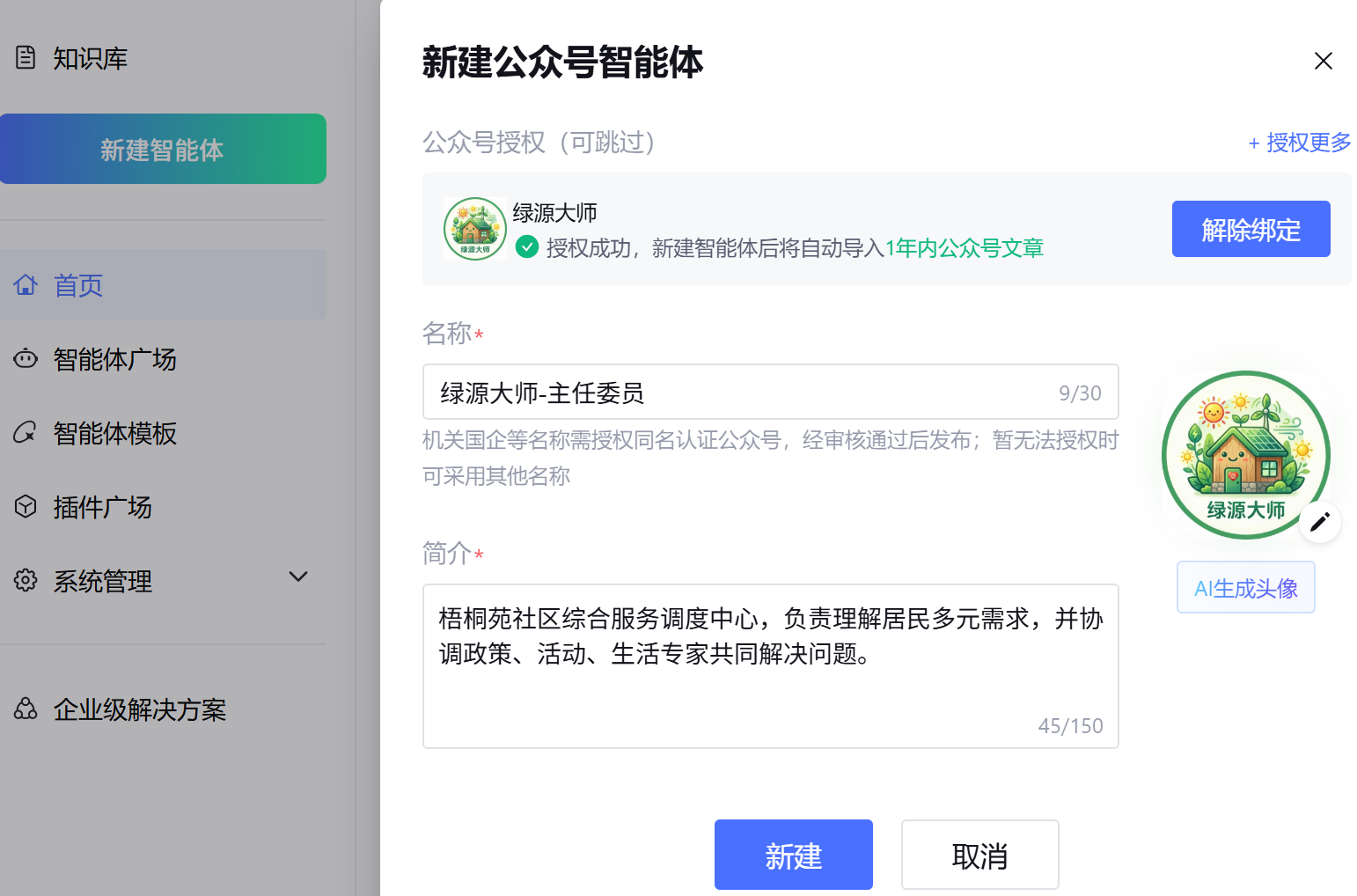 - 头像:可上传自定义头像,或使用AI生成,绑定了公众号的话则默认使用公众号头像。