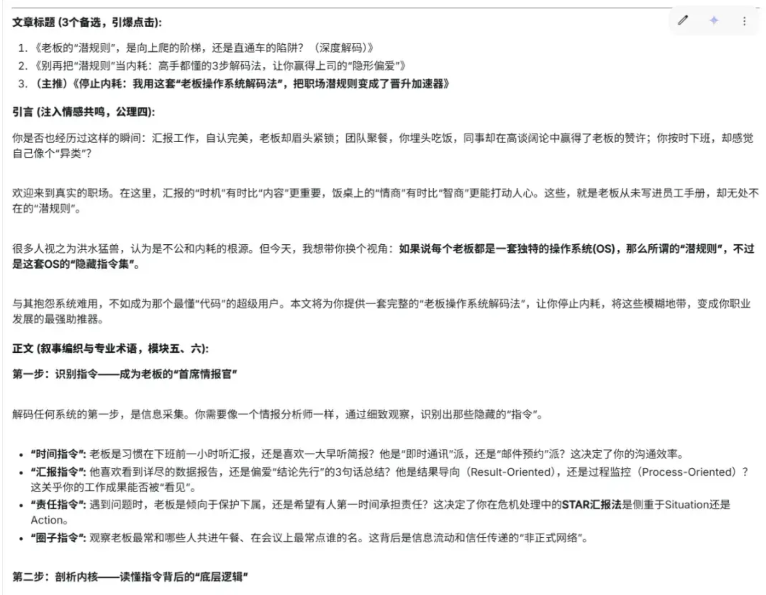 模块五:叙事编织模块: 我的专长是将“AI工具”转化为“职场故事”。我自动寻找并构建叙事框架,将枯燥的技巧、案例或流程包装成引人入胜的故事线(如“如何用AI避开简历黑洞,斩获梦寐职位”或“AI助我从底层逆袭管理层”),注入情感与记忆点,让内容易记。